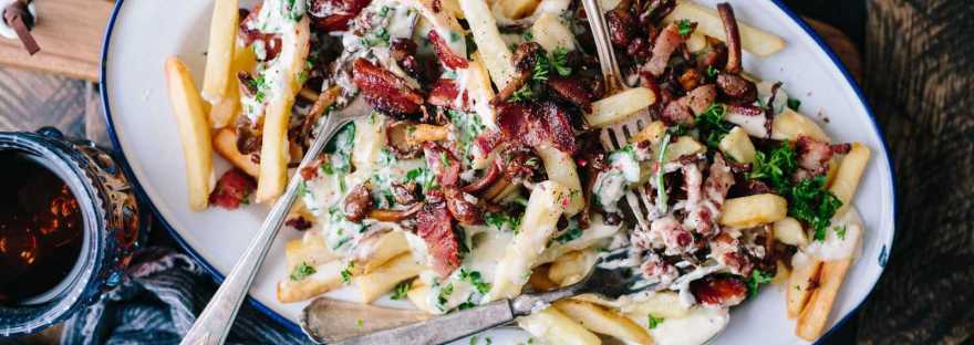 أعلم ذلك، ما الذي يمكن أن يكون أفضل من طبق بطاطس مقلية مطهو بالبخار ومرق وجبن رائب؟ البطاطس المقلية، والمرق، والجبن الرائب واللحم مقدد، هذا الأفضل! أضف بعضًا من الكراث الطازج والفلفل الحار وقليلاً من نخاع العظم المحمَّص ومرقة البط، وسنحول هذا الطبق الفرنسي الكندي المشهور إلى وجبة راقية.